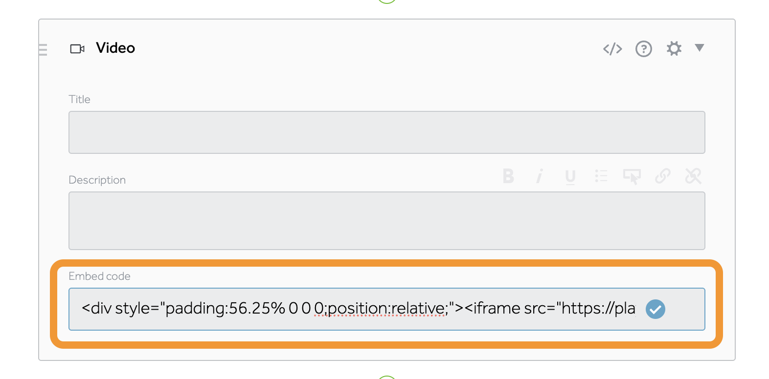 Paste the Vimeo embed code into the Embed code field. The video's details will automatically populate in the block.