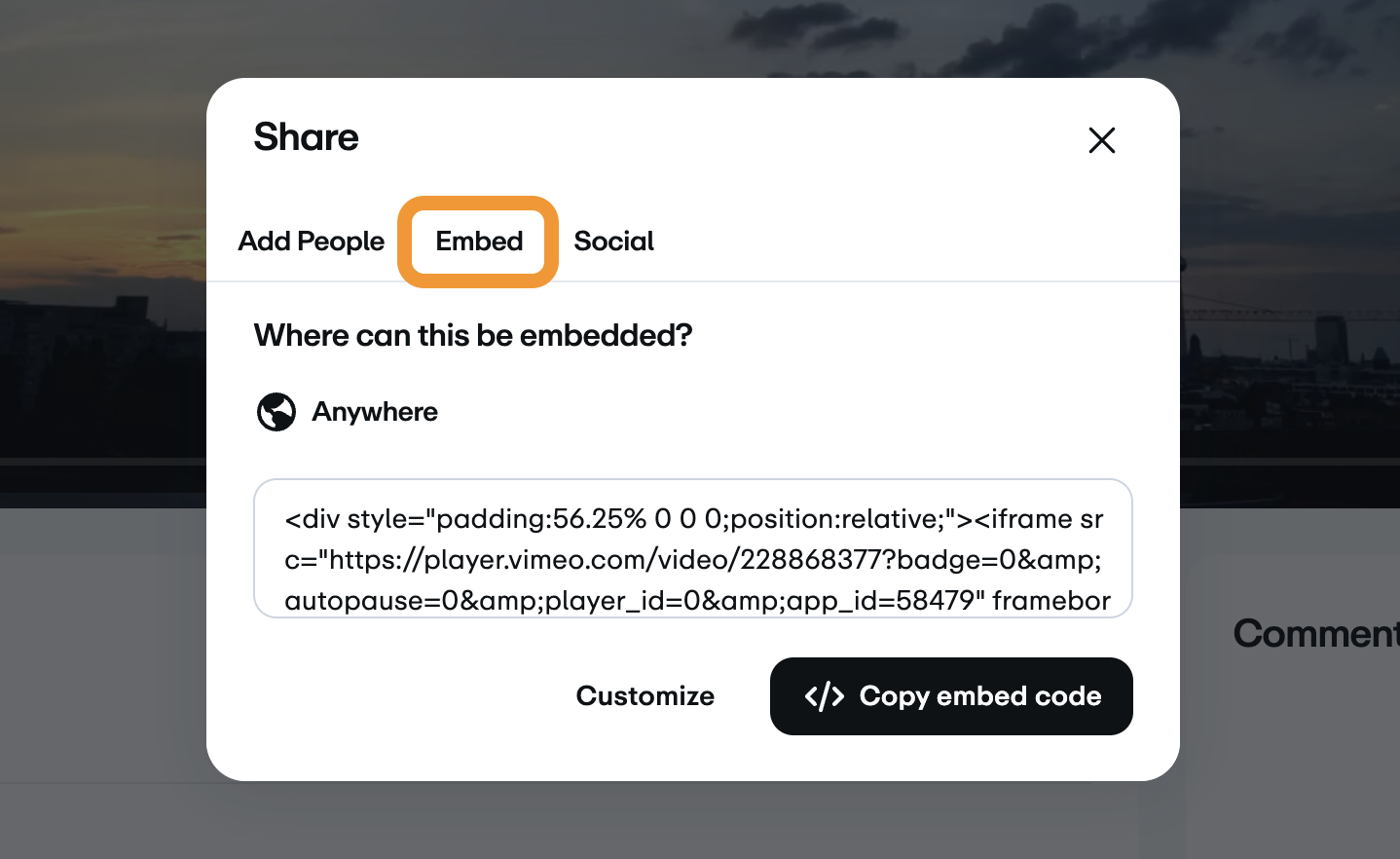 In the pop-up window, click the Embed tab, then copy the embed code.